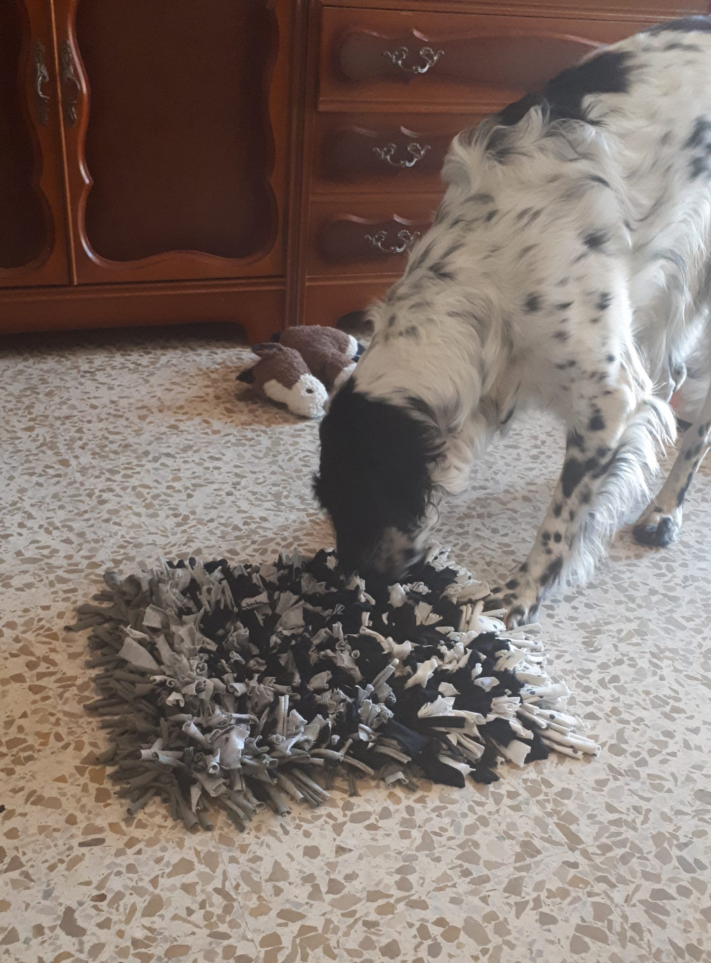 Los que me conocéis, sabéis que soy una loca de los juegos de olfato y la verdad las mantas olfativas nos hacen el trabajo, ya que no hace falta empezar a esconder premios por todo la casa. 😉